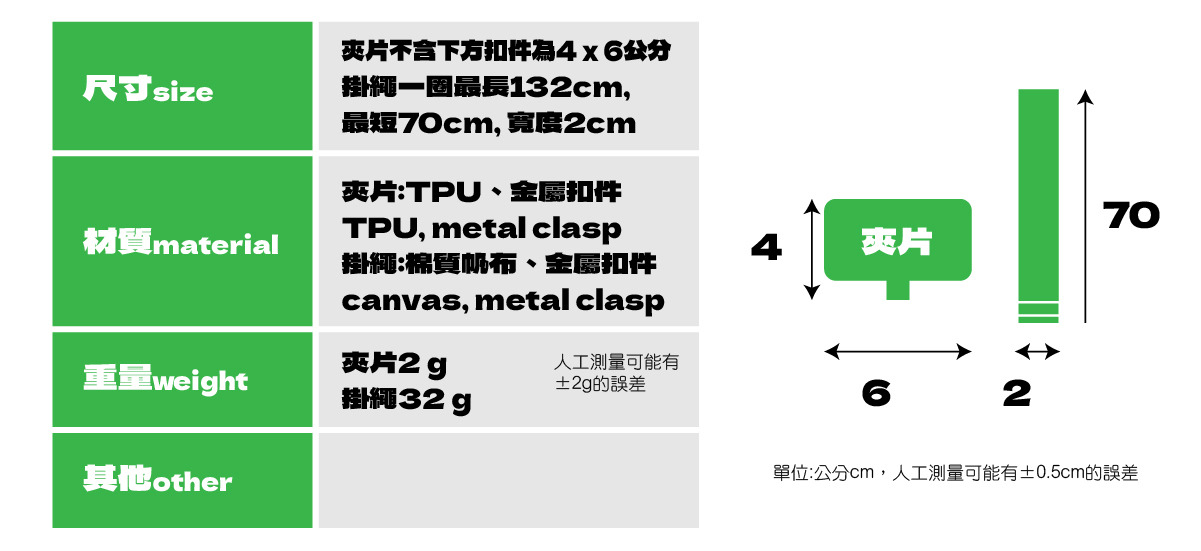 掛繩:一圈最長132cm, 最短70cm, 寬度2cm(人工測量約有1~2公分誤差)。