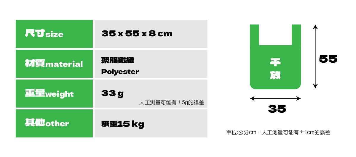 攤平含提把H35 x W 55 x D8 cm(人工測量約有1~2公分誤差)。