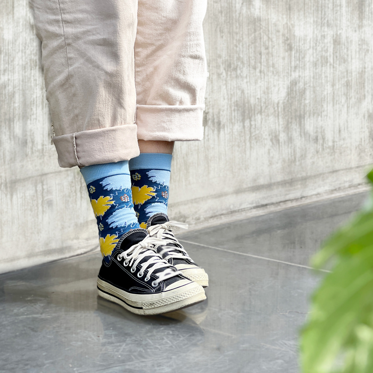❤︎雙扇蕨款式:深邃的靛藍色底映襯鮮豔的黃色圖案,視覺對比鮮明,展現活力與個性。