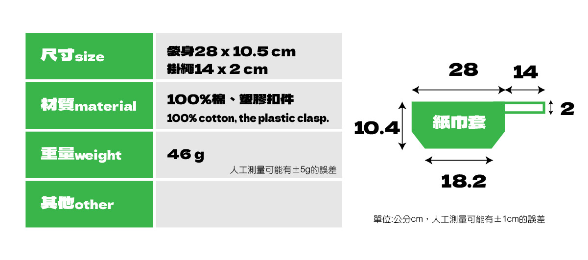 除了放在桌面上使用之外,紙巾掛袋掛繩附有鈕釦,也可隨意掛在牆上、門把、車座椅等。