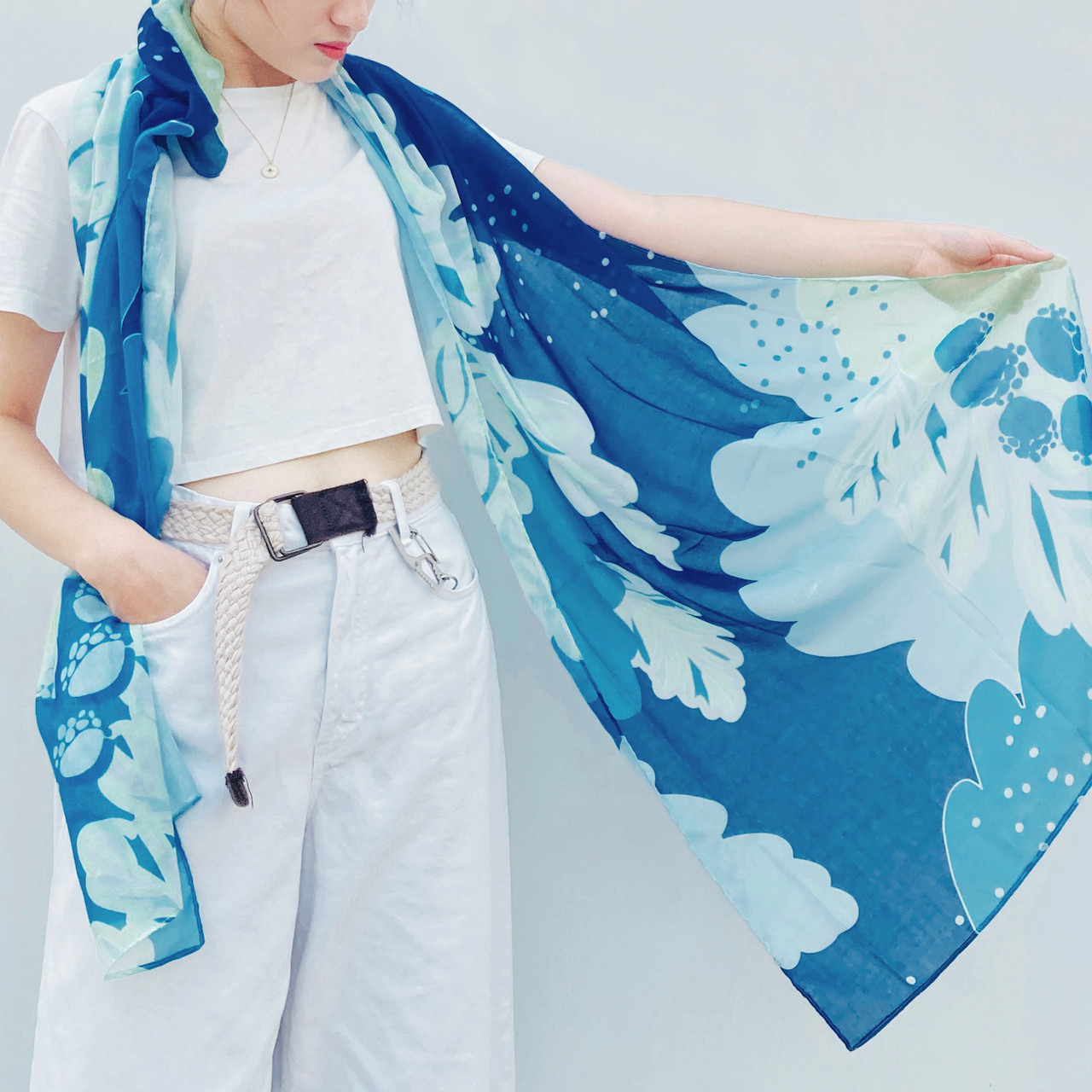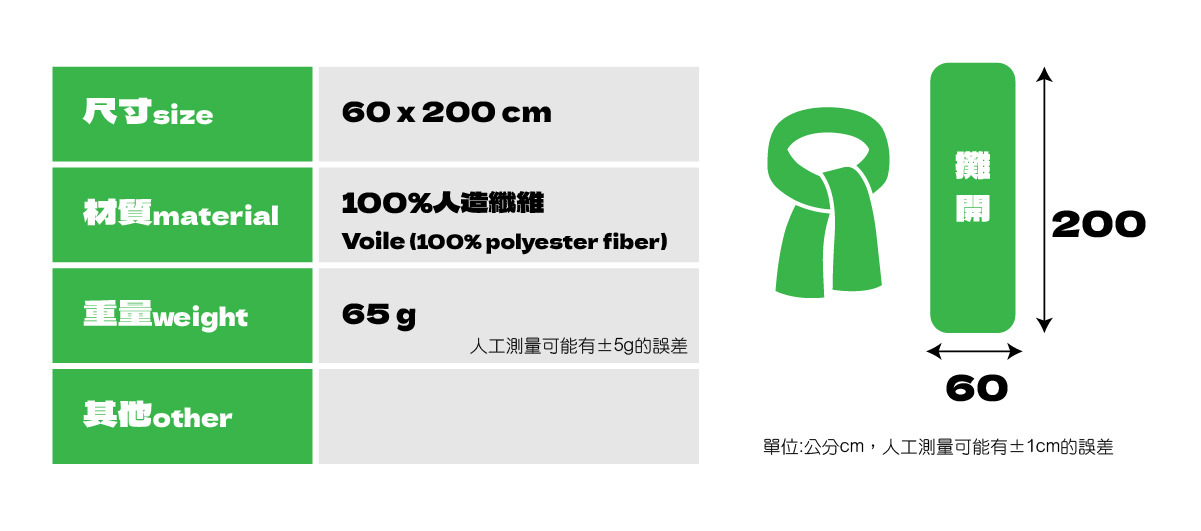 本材質質感柔軟、輕薄、透氣,可作為圍巾、披肩、防曬遮巾、沙灘遮裙等用途。